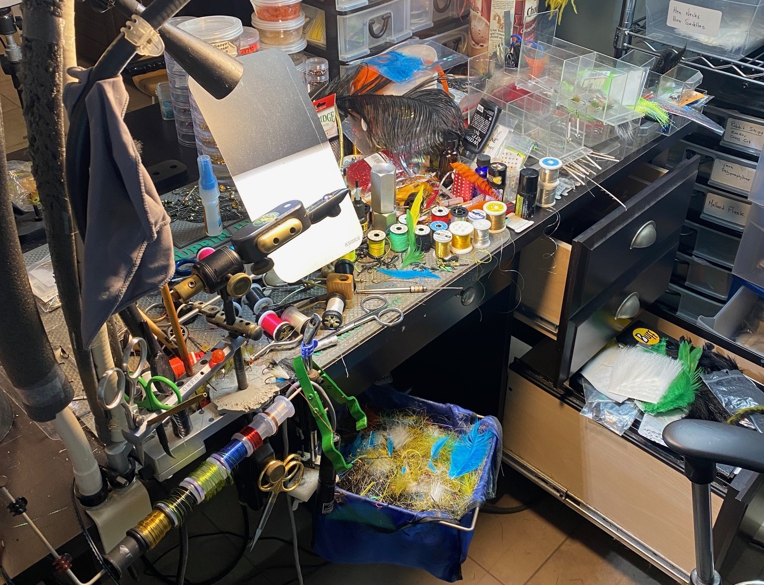 At first glance, a fly tying desk looks like the aftermath of a taxidermist’s garage sale — feathers everywhere, spools rolling off the table, and a half-finished streamer stuck to your elbow. But look closer, and you’ll see a kind of order emerge (sort of!)