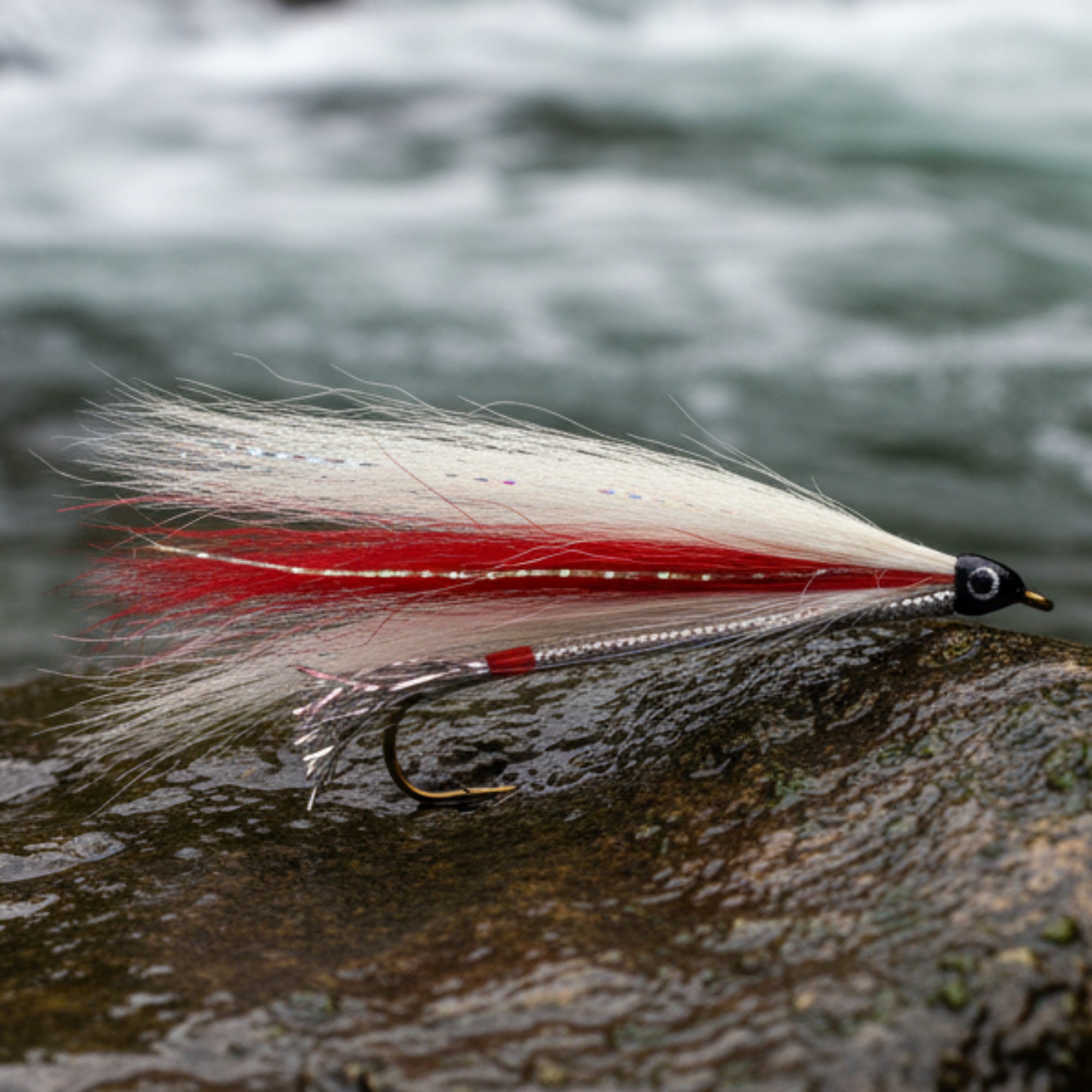 Its bold contrast of red and white creates a high-visibility target in both clear and stained water—ideal for early mornings, overcast days, or deeper pools. Finished with a silver tinsel body to reflect light like a fleeing baitfish, this fly is designed for anglers who know the value of simplicity, action, and tradition on the water.